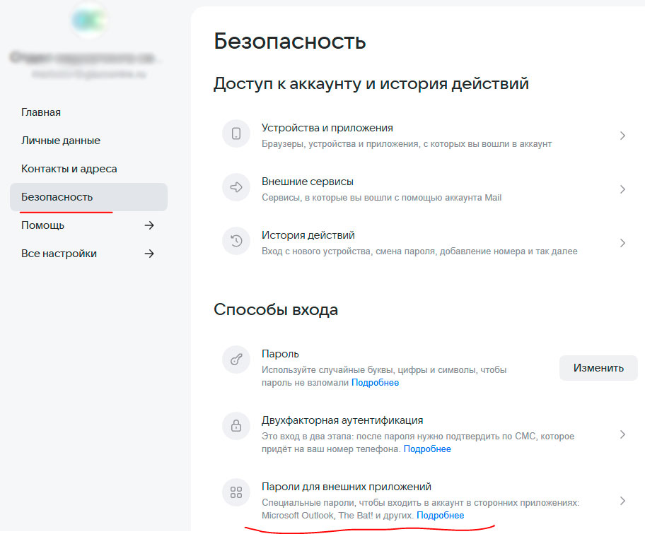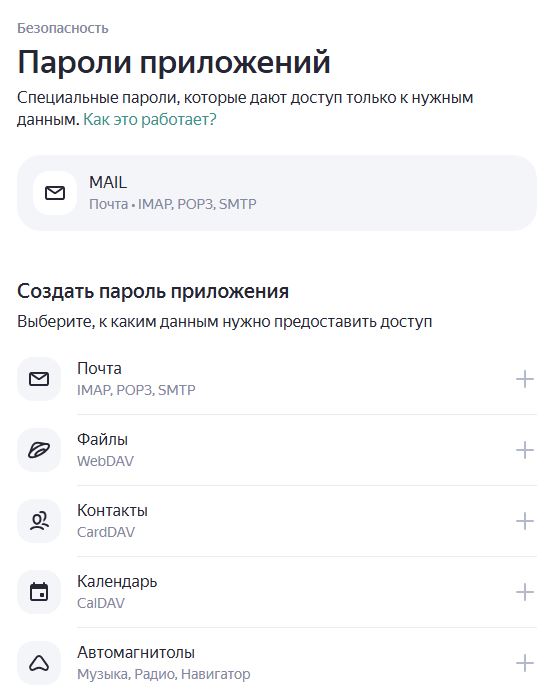 Затем переходим во вкладку Безопасность — Пароли приложений и по аналогии создаем пароль.