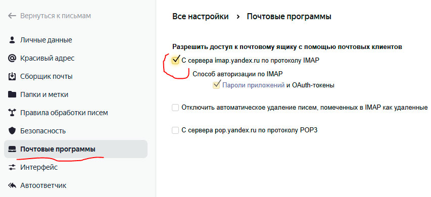Настройка почты Яндекс для вашего смартфона практически ничем не отличается от этой инструкции за одним исключением, что меню настроек немного отличается от mail ru. Заходим: Все настройки — Почтовые программы и устанавливаем галочку Разрешить доступ к почтовому ящику с помощью почтовых клиентов.